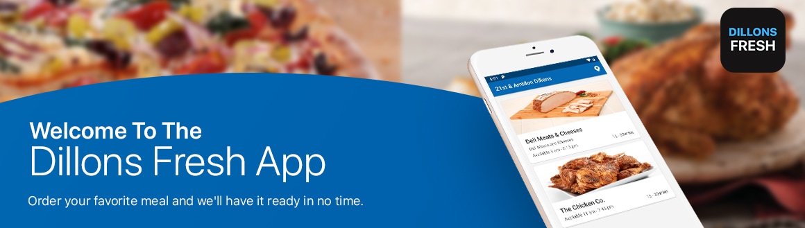 We currently offer Dillons Fresh at participating locations. Choose from deli meats and cheeses, freshly made chicken or a delicious pizza- place your order, come in and don't wait in line-just pick it up and go!